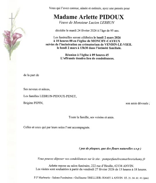 - Arlette LEBRUN née PIDOUX 95 ans (Monchy-Cayeux) voir le faire-part