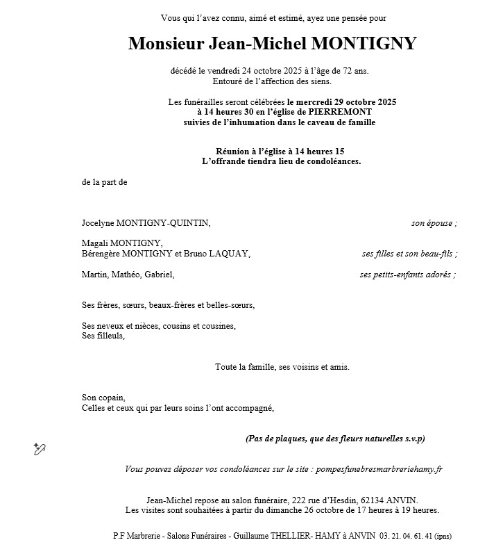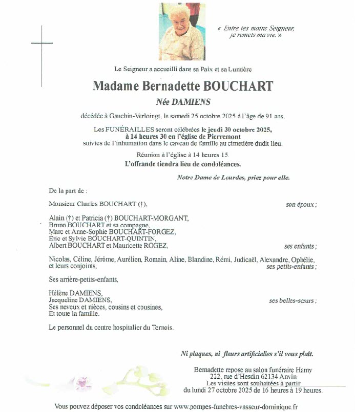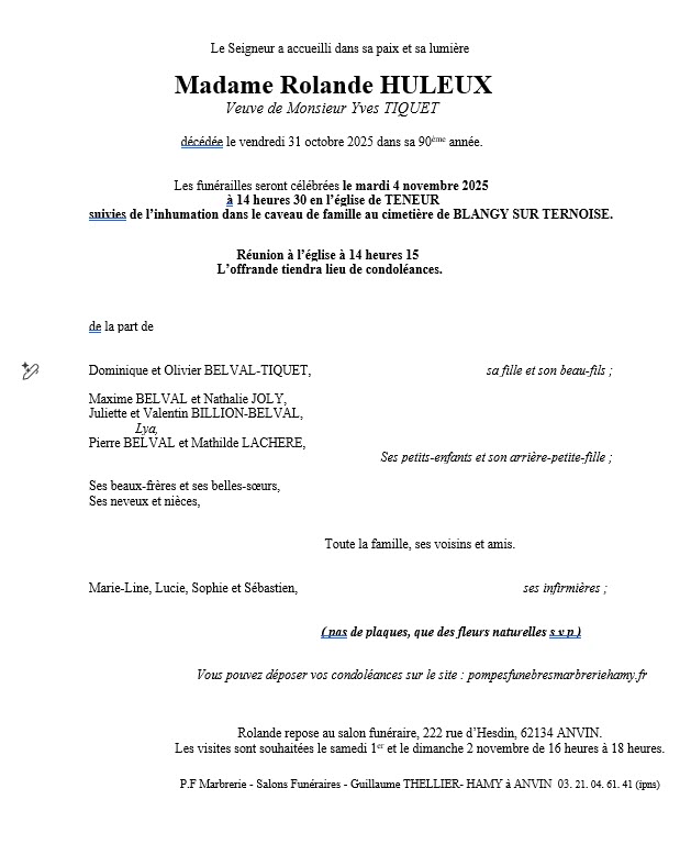 Funérailles mardi 4 nov à 10h à Oeuf-en-Ternois