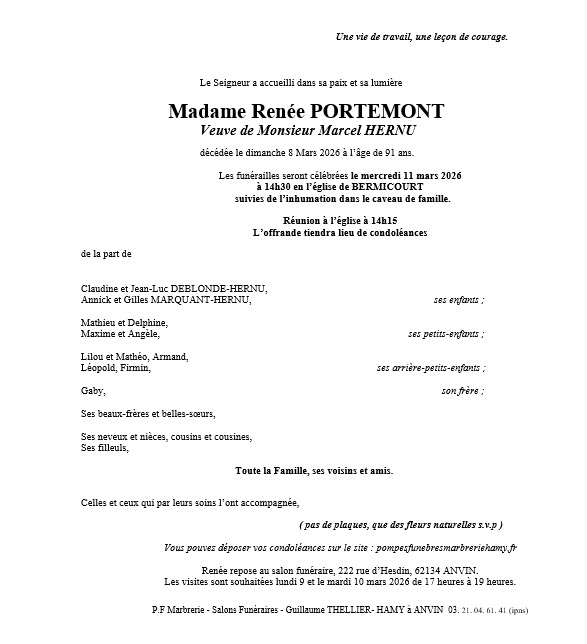 - Renée HERNU-PORTEMONT 91 ans (Bermicourt)
