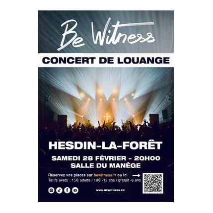 20h concert de louange avec le groupe "Be Witness" à la salle du manège à Hesdin. Réservation nécessaire (www.bewitness.fr)
