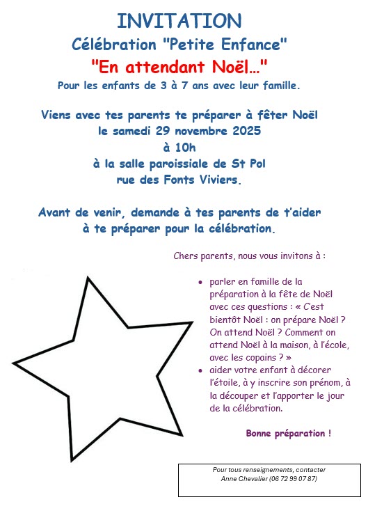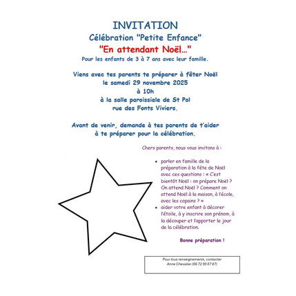 10h à la salle paroissiale de St-Pol/Ternoise (rue des Fonts Viviers). Célébration "Petite Enfance" « En attendant Noël…" Pour les enfants de 3 à 7 ans avec leur famille