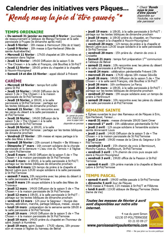 18h30, à la salle paroissiale à St-Pol/Ternoise : partage sur les textes bibliques de dimanche prochain