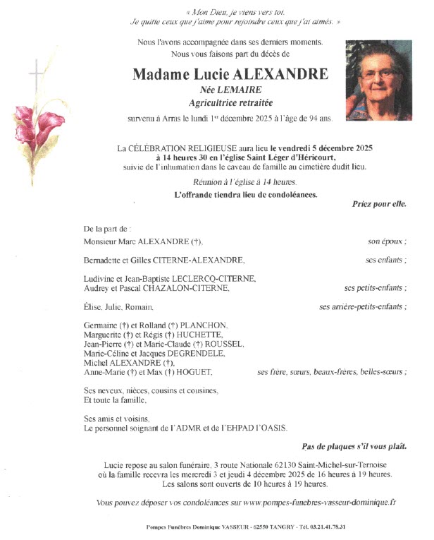 - Lucie ALEXANDRE-LEMAIRE, 94 ans (Héricourt) - voir le faire-part
