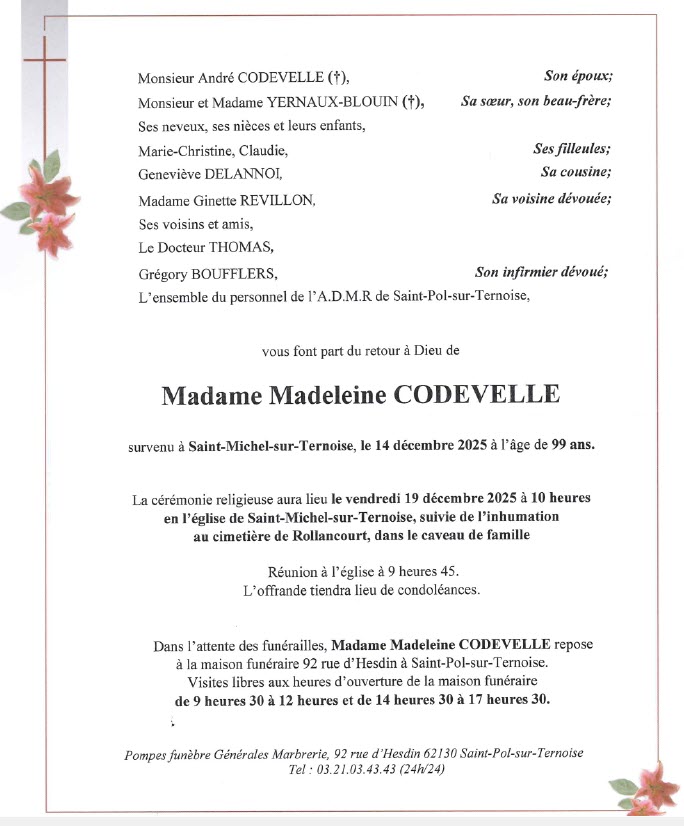 - Madeleine CODEVELLE, 99 ans (St-Michel/Ternoise)